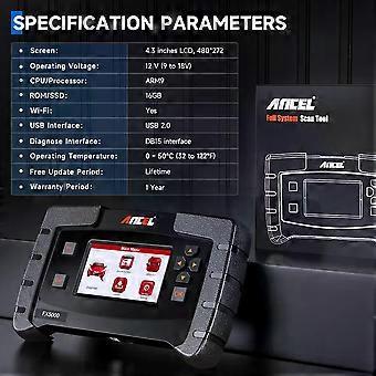 Hign-concerned Chemical:NoneElectronic:NoExternal Testing Certification:ceModel Name:ANCEL FX5000Software Version:NEWESTHardware Version:NEWESTBrand Name:ANCELOrigin:Mainland ChinaFeactures 3:Full OBDII FunctionsMPN:Car OBD2 Code Readers ScannersSpecial Function:ABS Bleeding , EPB Brake Reset , Oil ResetSupported System:ABS,EPB,SAS,TPME,IMMO,DPF,SRS,OIL...Accessories:Adapter Cable USB CableUser GuideOBD Interface:CAN /OBDII/EOBD/OBDManufacturer Part Number:ancel scanner fx5000 scan toolFeactures:3 Special FunctionUpdate:Lifetime Free UpdateType:Code Reader & Scanner ToolConnectivity:Wift / OBDIIFeatures1:Full System Diagnosis for most car makesFeatures2:Backlit Display, Check Engine Light Shut Off, Color Display, Erases Codes, Freeze Frame Displays, LCD Display, Internet UpdateableSupport Language:English, German, Spanish, Portuguese, DutchANCEL FX5000 All System Diagnosis Tool with 3 Hot Special Functions (ABS Bleeding/Oil Light Reset /EPB Brake Reset+ Full OBD2 Function + Lifetime Free Update via WIFI or USB ! ??ANCEL FX5000 Diagnostic Scanner Features Support 3 Hot Reset Services Enjoy pop-up guidance Fit for easy access to 3 most popular maintenance services in this diagnostic tool: Oil Reset; ABS Bleeding , EPB brake reset. *Menus vary by make, model, and year of gasoline or diesel engine vehicle. Email us your VIN data. All Systems Diagnostic This FX5000 diagnostic scanner can get OE-level analysis of ECM, ABS, airbag, SAS, DPF, EVAP, TPMS, BMS, EPB, among other available on-board systems. Fit for majority of car makes and models worldwide. *** NOT a bi-directional diagnostic scanner. Active Test, key programming is NOT available. Lifetime Free Upgrade via Wifi all system scanner skip the costly subscription to stay up to date. Buy now to enjoy lifetime free update via WiFi . Full OBDII Function +AUTOVIN Automatically identify vehicles make, model, year information, and quickly match the right software at a single touch upon this scan tool, with a full, clear, and accurate report automatically generated Fit for further analysis. *AutoVIN doesnt work on ALL cars. Feel free to enter the VIN data manually. Work on 96+ Car Brands FX5000 work for most OBDII/EOBD/CAN/JOBD car models .( Most post-1996 American cars; post-2001 European cars; 2002 Asian cars No built-in battery No built-in batteryNo Charging required ! Plug and display ??Oil Light Service Reset + EPB Service + ABS Bleeding ABS Bleeding: Whenever you change a part of the brake system, you will need to bleed the brake system afterward. This means removing all the air in the system. Due to the air is compressible, it would make the brake pedal will feel soft. Once the brake pedal being soft and mushy, the air will have to be pushed out of the way before the fluid can do what it is supposed to do. This can be dangerous because it means that it will take longer to stop. Generally, bleeding brakes aren't too hard, but what if air gets in the ABS Module. Well, bleeding the ABS module can be a bit more of a challenge. You might need to take this tool to cycle the valves in the ABS module to let the air out. Oil Light Reset: scanner for cars offers help to reset the Oil Life Reminder (turn off the Oil Service Light) when the replacement of engine oil is done in case of the impurities in oil may damage the engine. So vehicles can recalculate another optimal oil life change interval depending on the vehicle driving conditions and climate. Your driving safety also gets ensuring. EPB Service: Reset the brake pad after the repairs in the electronic parking brake system is done, which includes deactivation and activation of the brake control system, bleed brake fluid, open and close brake pads, and setting brakes after disc or pad replacement. Diagnoses EPB caliper functionality, initializes the wear indicator if new pads are installed and deactivates or re-activates brake control system. By using this function, the braking process is therefore made much simpler and easier. A Professional Diagnostic Tool for You!---ANCEL FX5000 ??Full Systems Diagnostic Scanner From ANCEL: ANCEL FX5000 scan tool meets your expectation for automotive scanner from entry level to professional, which includes both obdii and all systems diagnosis, even with most popular maintenance functions--ABS bleeding & oil reset & EPB service reset. ??All Systems Diagnostic + Live Data in Graphic + Data Record and Playback & Print: The biggest advantage of ancel fx5000 car diagnostic reader which makes it different from other automotive diagnostic tool with the same price range is that it can diagnose many other systems besides Engine, Transmission, Airbags, ABS systems, such as BCM, HAVC, BMS, Digital Radio, Instrument Cluster, TPS, Park Steer Assist, D.P.F., TPMS