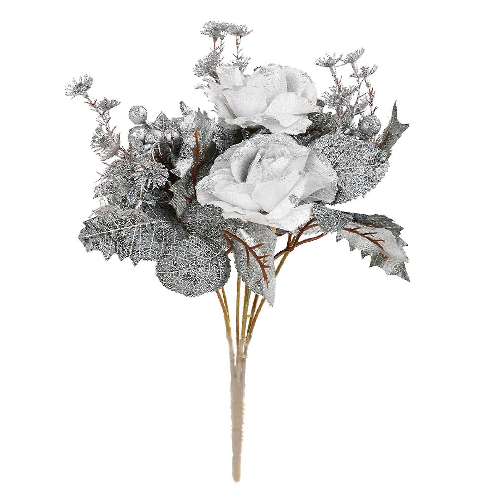 Multi headed rose imitation flower artificial Christmas bouquet - silver color, total height 26cm, stem 8cm, maximum flower head diameter 7cm, silk cl
