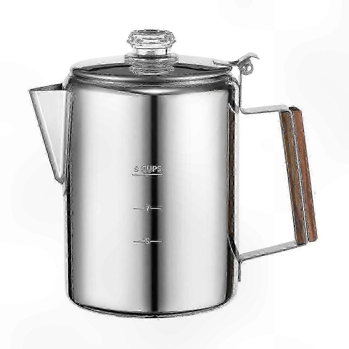 All metal interior and exterior constructed from high-quality, food-grade stainless steel for excellent corrosion resistance. Ergonomically designed, heat-resistant hardwood handles provide comfortable pouring and filling. Durable construction withstands rugged outdoor use, making it ideal for camping. This 9-cup camping coffee percolator brews enough coffee to share, ensuring no one misses out. Designed for both indoor and outdoor use, it is compatible with campfires, stoves, induction cooktops, and grills. A reliable choice during power outages, allowing you to enjoy freshly brewed coffee anytime. Also a great addition to any home kitchen. Portable and easy to use—simply add water and coffee grounds, then place over a heat source to boil. The coffee pot doubles as a stylish kitchen decoration. Features a comfortable, heat-resistant hardwood handle for safe and easy handling. Designed for consistent, rich, and full-bodied coffee flavor. Larger capacity and faster brewing than standard stovetop or drip models. Produces a more flavorful cup compared to basic boiling methods. Material: Stainless steel. Color: Silver. Package contents: 1 x coffee pot. Note: Light reflection and display differences may cause slight color variations. Measurement error allowance: +/- 1-3 cm.