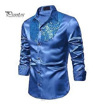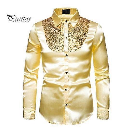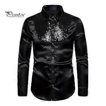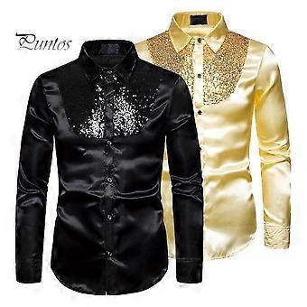 Men Sequin Dress Shirt Shiny Metallic Wedding Shirt Lapel Long Sleeve Button-Down Shirt Solid Color Slim Fit Shirt
