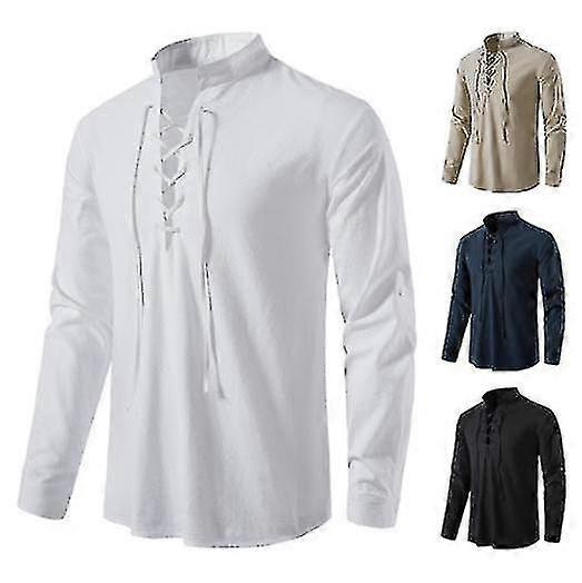 Men's Linen Cotton Henley Shirt Roll-up Long Sleeve Shirt -l