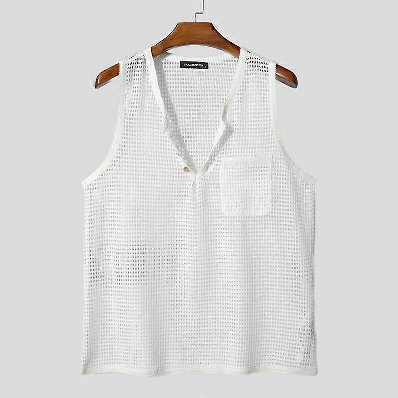 INCERUN Men V Neck Sleeveless Hollow Mesh See Through Party Beach Tank Tops