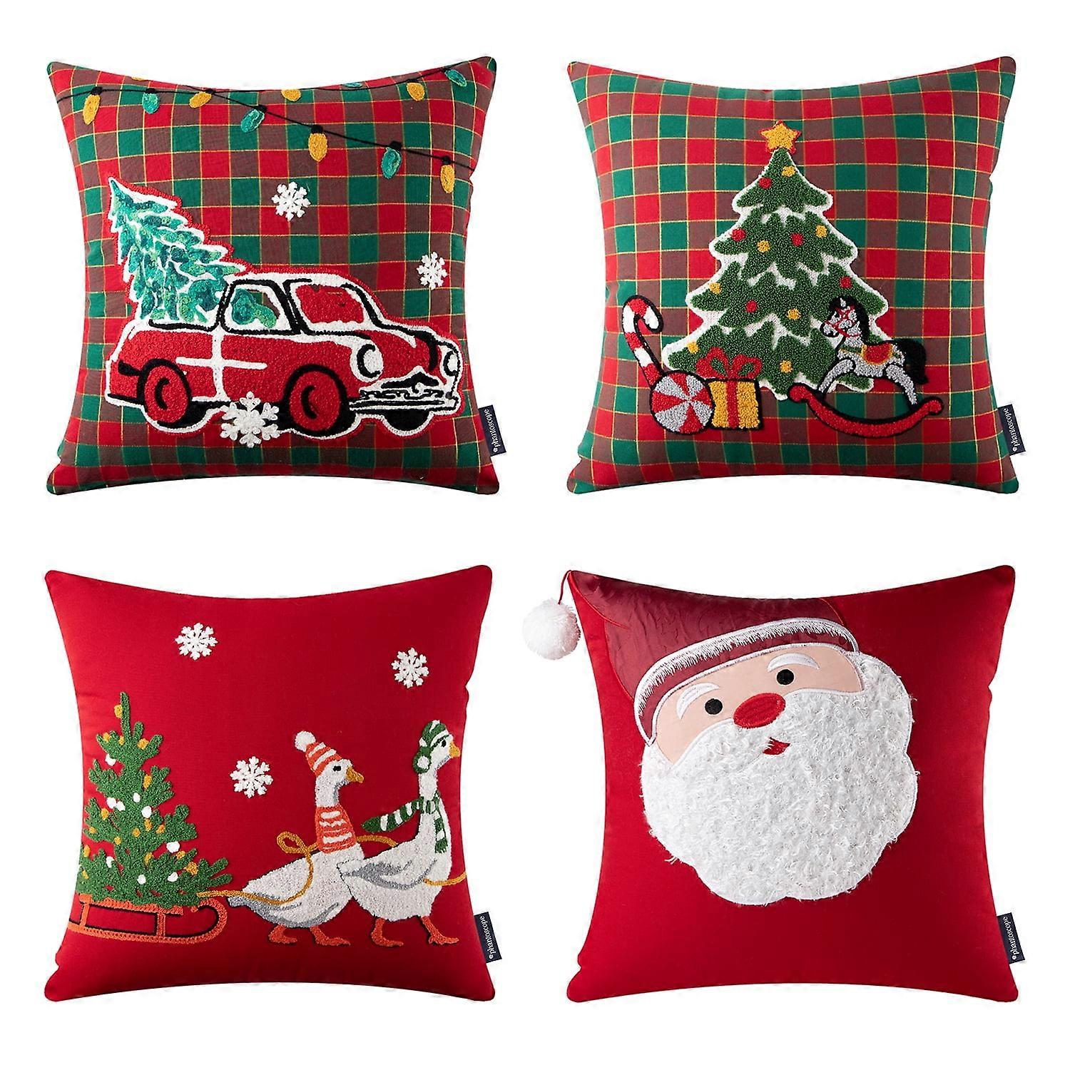 Christmas Cotton Pillow Cover Set (18"x18", 4 pcs) with Santa, Tree & Red Car Design – Compatible with inserts