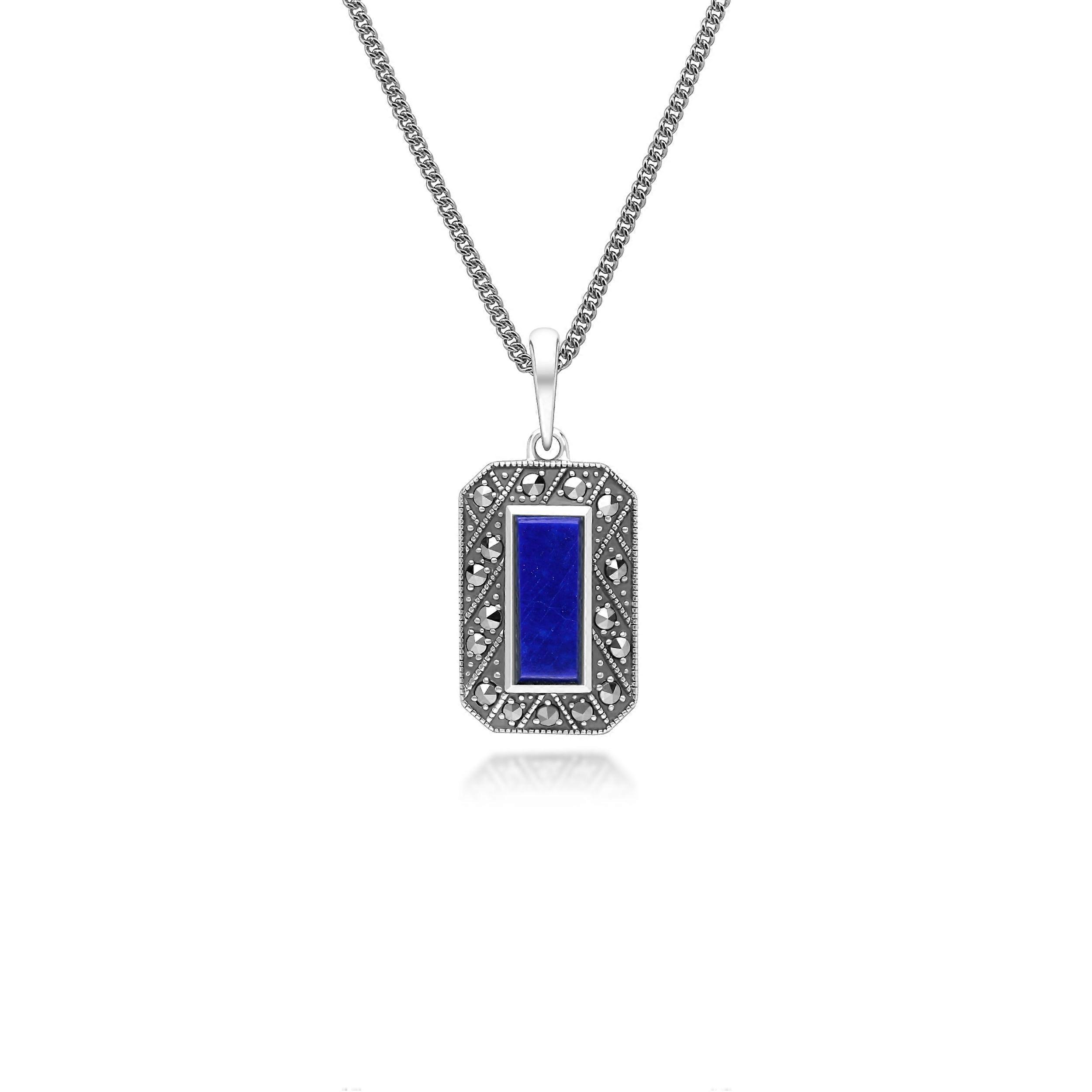 Art Deco Style Rectangle Lapis Lazuli and Marcasite Pendant Necklace in Sterling Silver