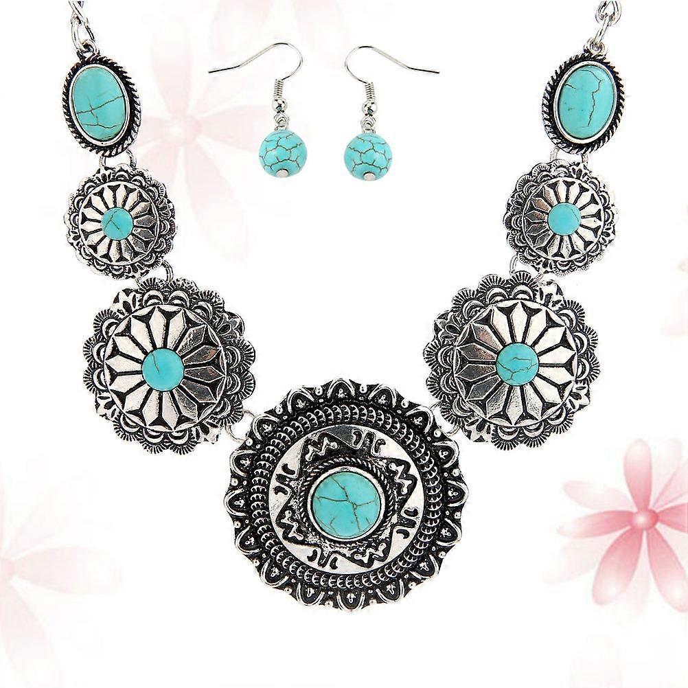 Elegant Flower Pendant Necklace with Turquoise Decor and Matching Earrings in Silver Color Made of Durable Alloy for Decor