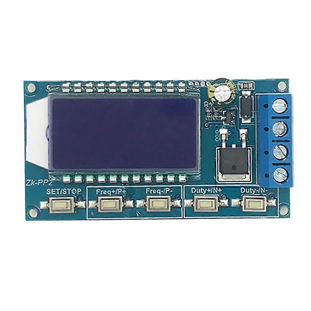 Features: 1. Dual mode:PWM mode and PULSE mode; 2. LCD high definition display; 3. Support frequency adjustment; 4. Support duty cycle adjustment; 5. High precision detection; 6. Support power-down memory function; 7. 1-Channel signal output; 8. Support reverse protection; 9. High current output; 10. Direct drive LED/Motor/solenoid valve Parameters: 1.Product name: -PP2 PWM Signal Generator;2.Model: -PP2;3.Work voltage:DC 3.3V-30V;4.Frequency range:1Hz~150KHz; 5.Motor speed control:20KHz(Usually);6.Frequency accuracy:2%;7.Duty cycle range:0.00%-100%; 8.Output Current:Less 8A(MOS Switch);9.Number of pulses:1~9999 or Infinite; 10.Delay time:0.000s~9999s;11.Pulse width:0.000s~9999s;12.Time accuracy:1ms;13.Output amplitude:Same to input voltage;14.Work Temperature:-40~85;15.Work Humidity:0%~95%RH Use steps: 1.Connect to power supply. 2.Select work mode as following manual. 3.Short or long press button 'FREQ+' or 'FREQ-' to set parameter. 4.Short or long press button 'DUTY+' or 'DUTY-' to set parameter. 5.Connect to load. Application: 1.Square wave signal generator, generating square wave signal for experimental development; 2.Used to generate a square wave signal that controls the motor driver; 3.Generate adjustable pulses for use by the MCU; 4.Dimmer; 5.Speed governor Note: 1.It's 1-channel signal output signals. 2.Its maximum output current is 8A.Therefore it can directly drive high-power devices such motor. 3.Please read use manual and before use. Practical application: 1.PWM output 20KHz,60% : Select PWM mode.Set frequency to 20.00 and duty cycle to 060%. 2.Output turn ON 0.6s,OFF 0.2s,infinite loop : Select PULSE mode.Set positive pulse width to 0.600 and negative pulse width to 0.200.Delay time to 0.000.Number of pulses to "----". 3.Delay 5s after power ON or press 'STOP' button.Then output turn ON 0.6s,OFF 0.2s,infinite loop : Select PULSE mode.Set positive pulse width to 0.600 and negative pulse width to 0.200.Delay time to 5.000.Number of pulses to "----". 4.Delay 5s after power ON or press 'STOP' button.Then output 10ms high level signal,10ms low level signal,cycle 100 times : Select PULSE mode.Set positive pulse width to 0.010 and negative pulse width to 0.010.Delay time to 5.000.Number of pulses to 0100. 5.Delay 5s after power ON.Then keep output : Select PULSE mode.Set positive pulse width more than 0(any value) and negative pulse width to 0.000.Delay time to 10.00.Number of pulses to "----". colour: blue Material: ABS Size: 60x32mm Package Contents: 1 x Pulse Signal Generator Only the above package content, other products are not included. Note: Light reflection and different displays may cause the color of the item in the picture a little different from the real thing. The measurement allowed error is +/- 1-3cm.