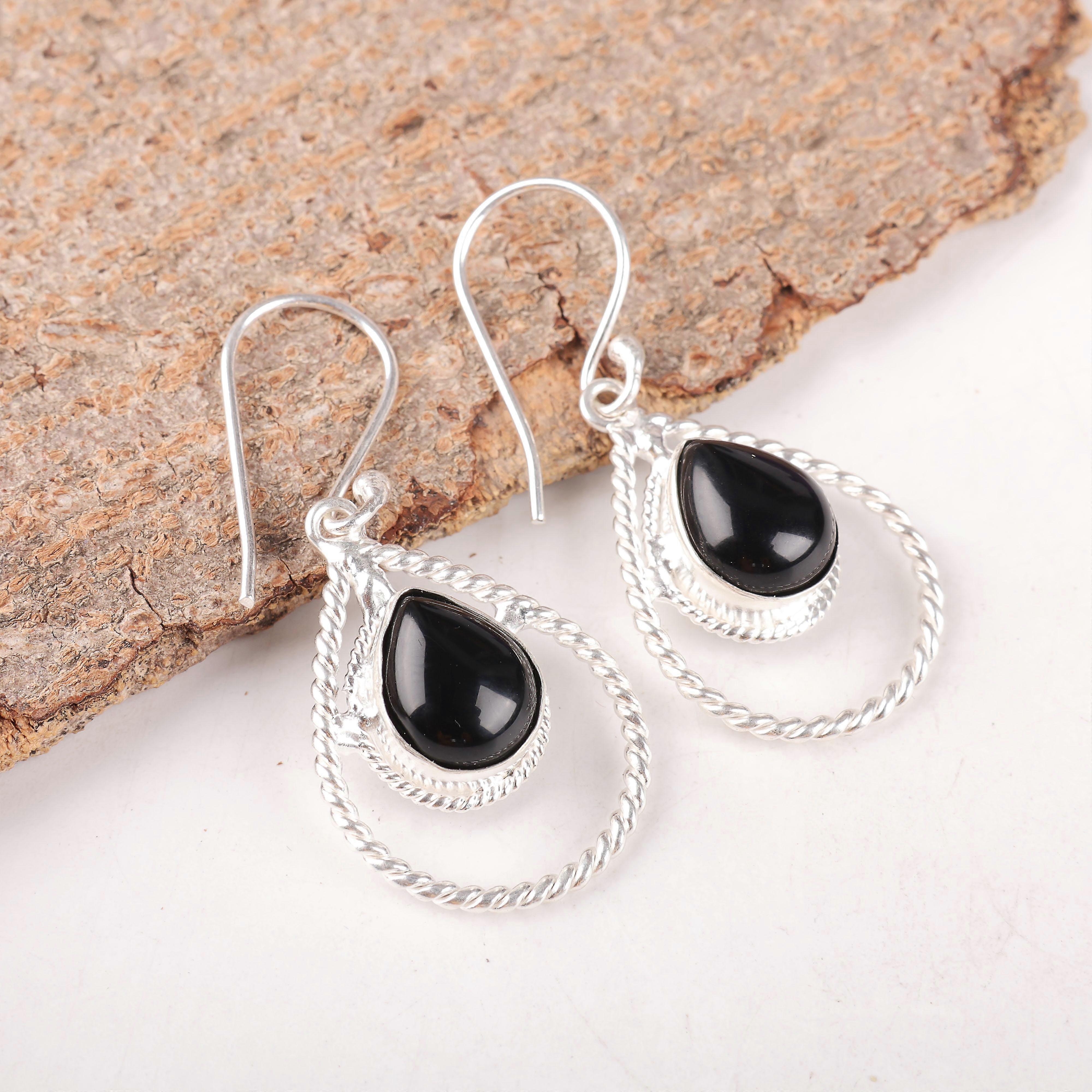 Black Onyx Cab Gemstone Jewelry, 925 Sterling Silver Earrings, Bohemian Onyx Silver Earrings For Thanksgiving Gift