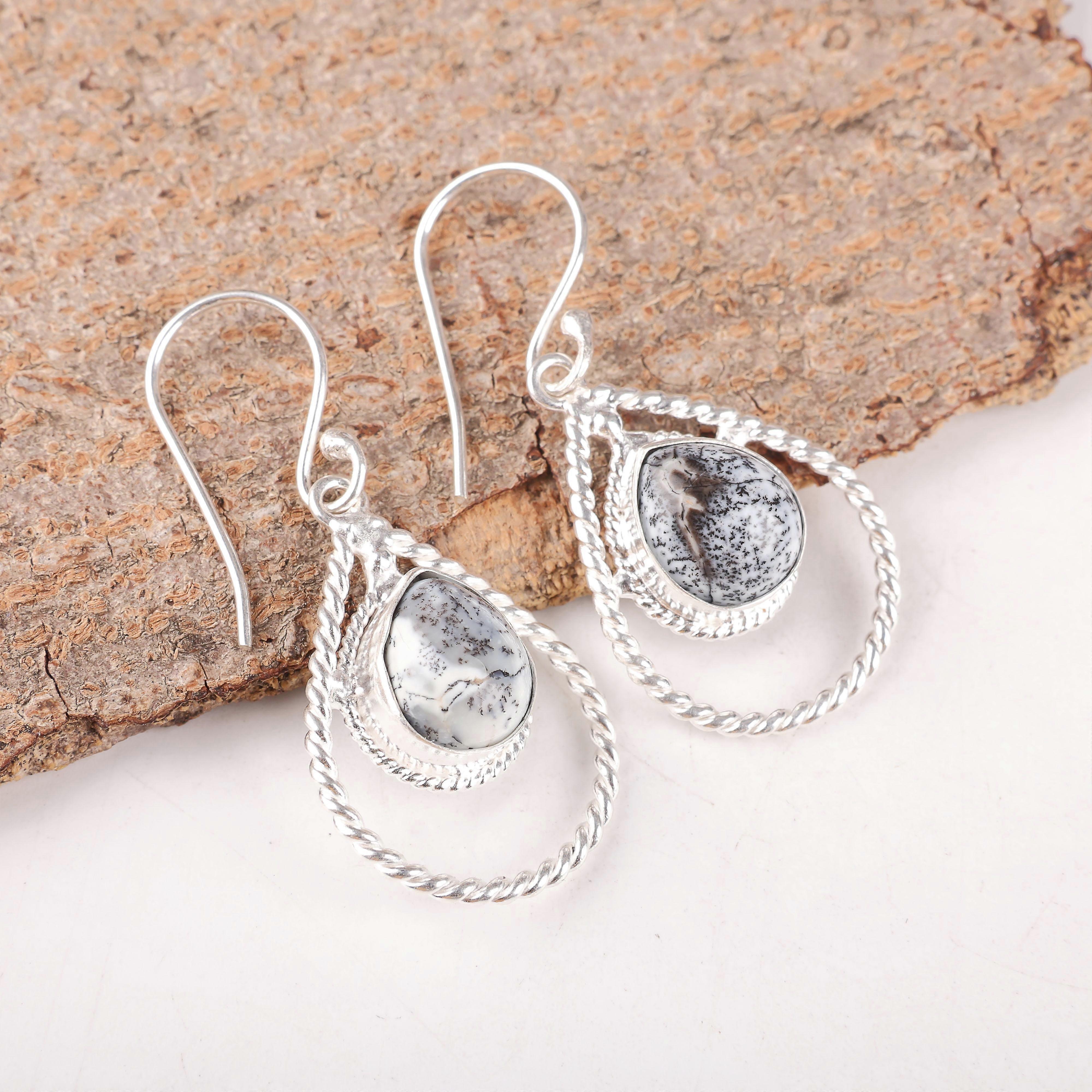 Dendritic Opal Gemstone Jewelry, Handmade Silver Earrings, 925 Sterling Silver Meditation Earrings Grandma Gift For Her