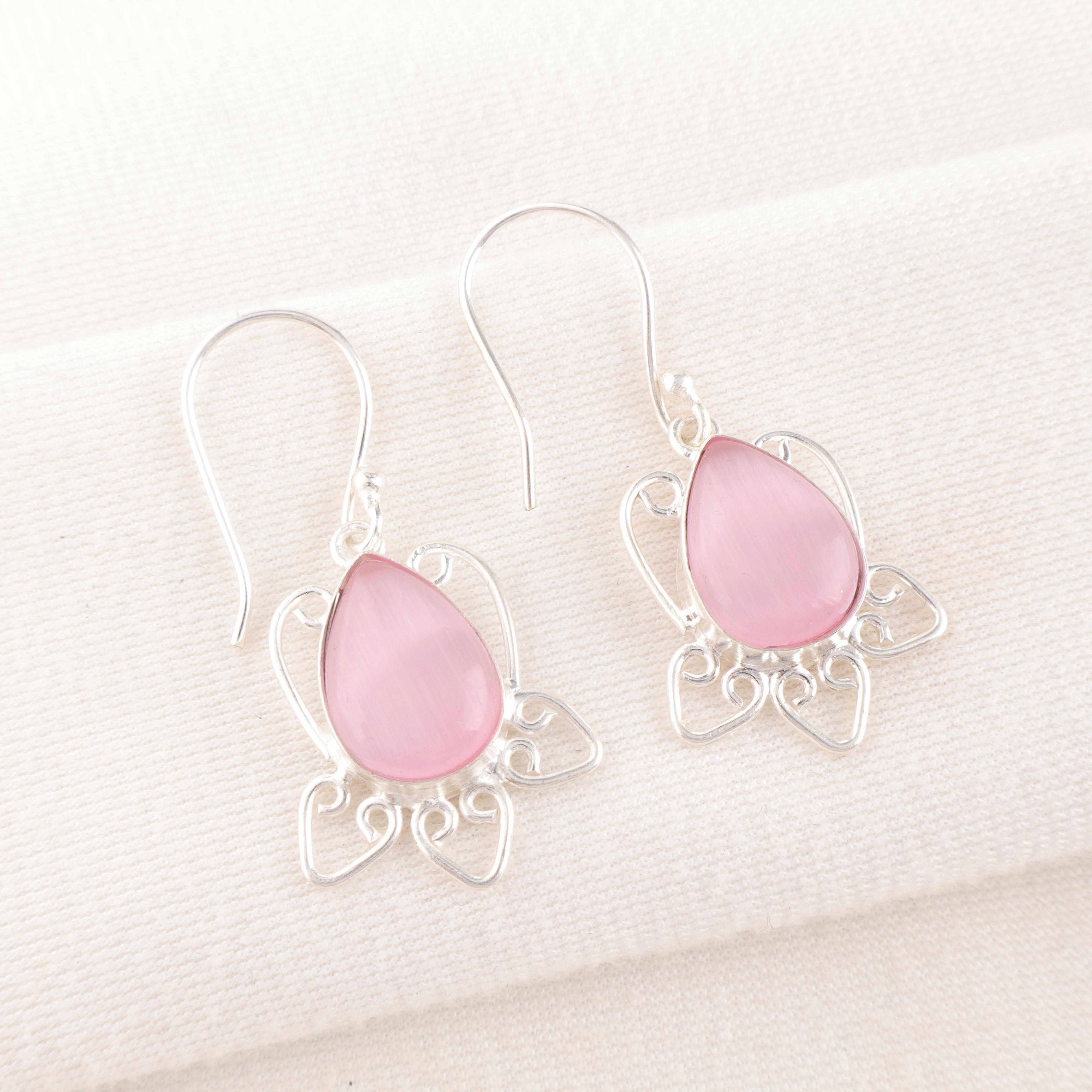 Pink Cat's Eye Gemstone Jewelry, 925 Solid Sterling Silver Earrings, Handmade Silver Earrings For Wedding Gift