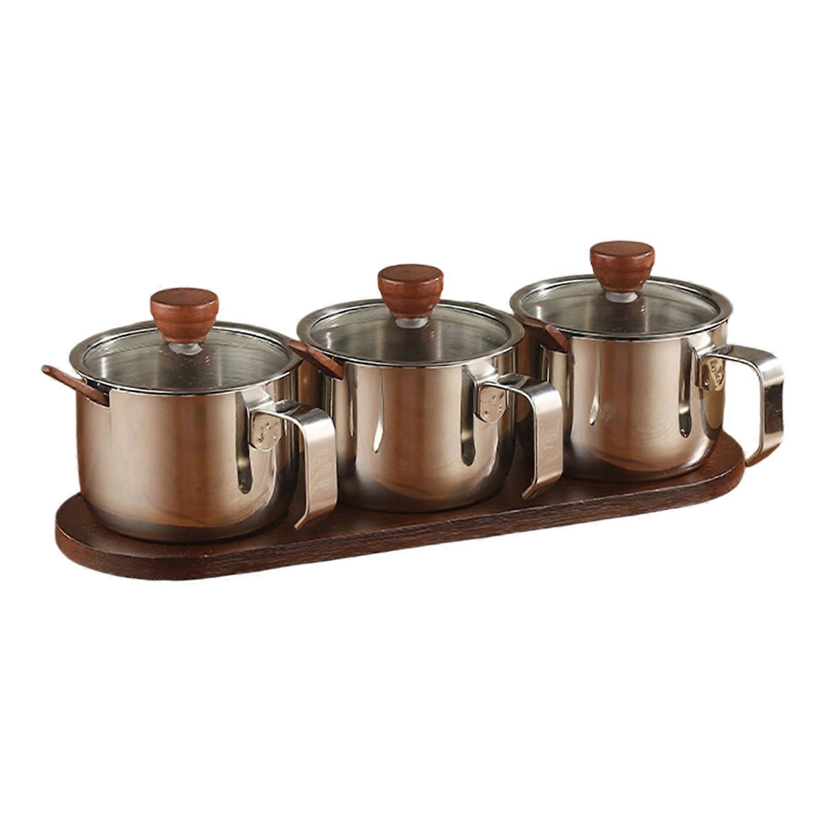Hygienic 304 Untarnished Condiment Bottles Set With Tight Seal Closures And Oaken Display Stand Silver