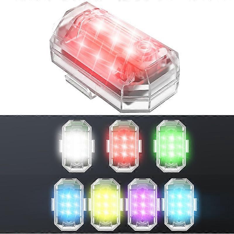 M3 Vibration Sensing Motorcycle Bicycle Aircraft Explosion Lights Cruise Flashing Anti-rear-end Collision Light 1. 7 colour variable, multiple modes, long life 2. Easy installation, laminated protection, cool at night, high brightness LED 3. High bright multi-colour wick, universal flashing light, widely applicable, improve the night warning effect and signal tracking 4. Deeply waterproof, no fear of rain 5. Suitable for: motorbikes, electric bikes, bicycles, drones, traversing planes, fixed-wing, model cars and other models 6. Seven colours can be switched: white, red, green, blue, yellow, violet, ice blue light 7. Multiple modes can be adjusted: seven colours of fast flashing, seven colours of slow flashing, seven colours of SOS mode, seven colours of constant light, civil aviation mode, cycle mode and other 30 modes with memory function 8. Setting mode: fast strobe light, slow strobe light 9. Power supply: USB charging built-in battery 10. Battery capacity: 3.7V 350maA 11. Charging current: 1A 12. Charging time: approx. 90 minutes 13. Operating time: approx. 3.5 hours when flashing 14. Charging voltage: 5V 15. Material: ABS 16. Power: 6.5W 17. Mounting method: hook and loop fastenerrubber band 18. Dimensions: 48 x 34.3 x 18.4mm 19. Weight: about 17.8g Packing list. -1 x flashing light -1 x USB charging cable -1 x instruction booklet -2 x hook and loop fastener -4 x rubber bands