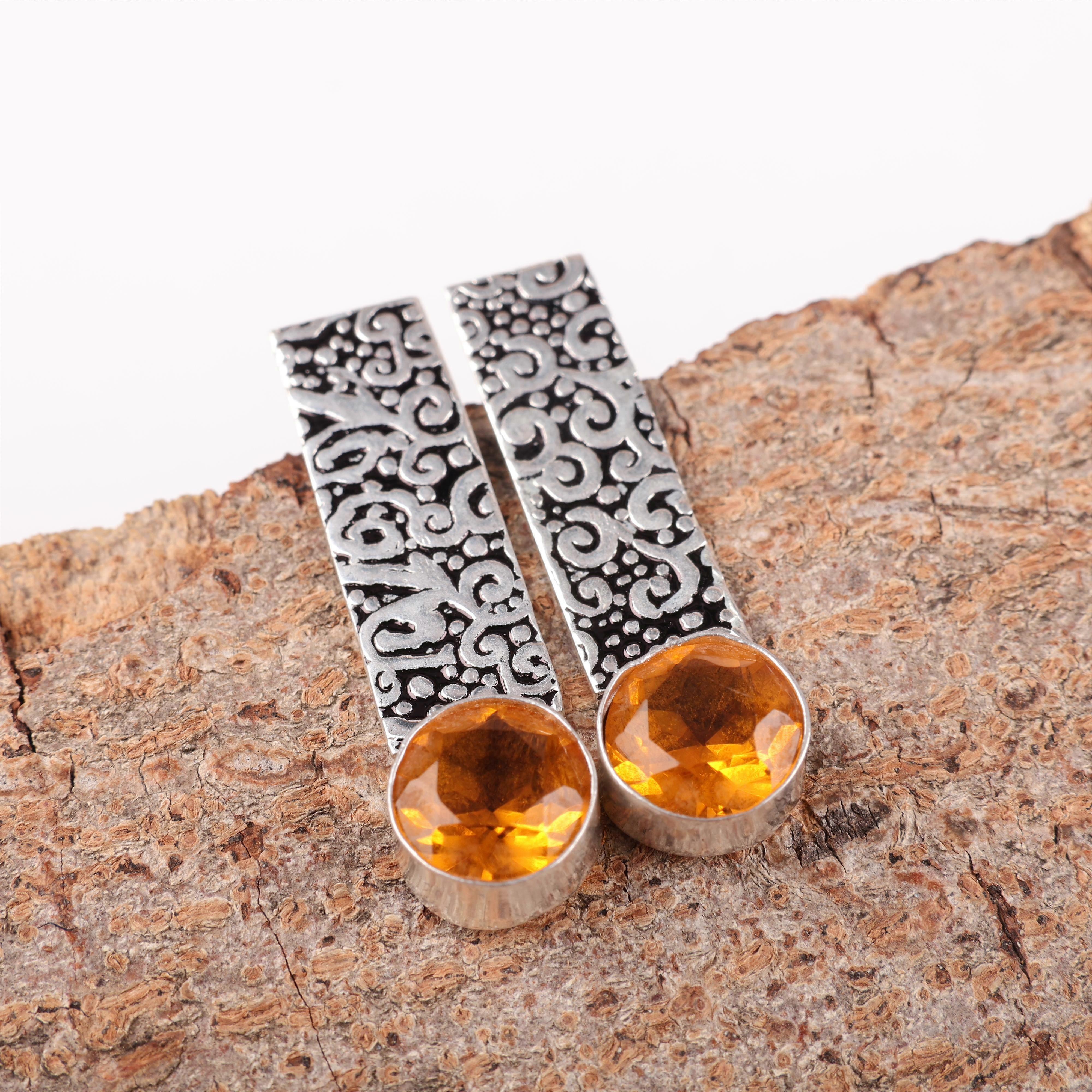 Welcome to our little shop, where you can find handmade jewelry and more, for you and your loved ones. Citrine Gemstone Earrings Jewelry, 925 Solid Sterling Silver Earrings, Handmade Bohemian Silver Earrings For Wedding Gift Main Stone: Citrine Main Stone Creation: Lab Created Main Stone Shape: Round Metal: Sterling Silver Metal Purity: 925 Manufacture Country: India Item Weight: 21.25CT (Approx) Stone Size: 8mm Note: This jewelry is made of Lab Created gemstones, So their can be difference in the gemstone shade & color because the picture is taken in bright lightening conditions And the product you get in hands may slightly vary from the picture shown and not exact same as picture. And this is the beauty of each jewelry being different than other.