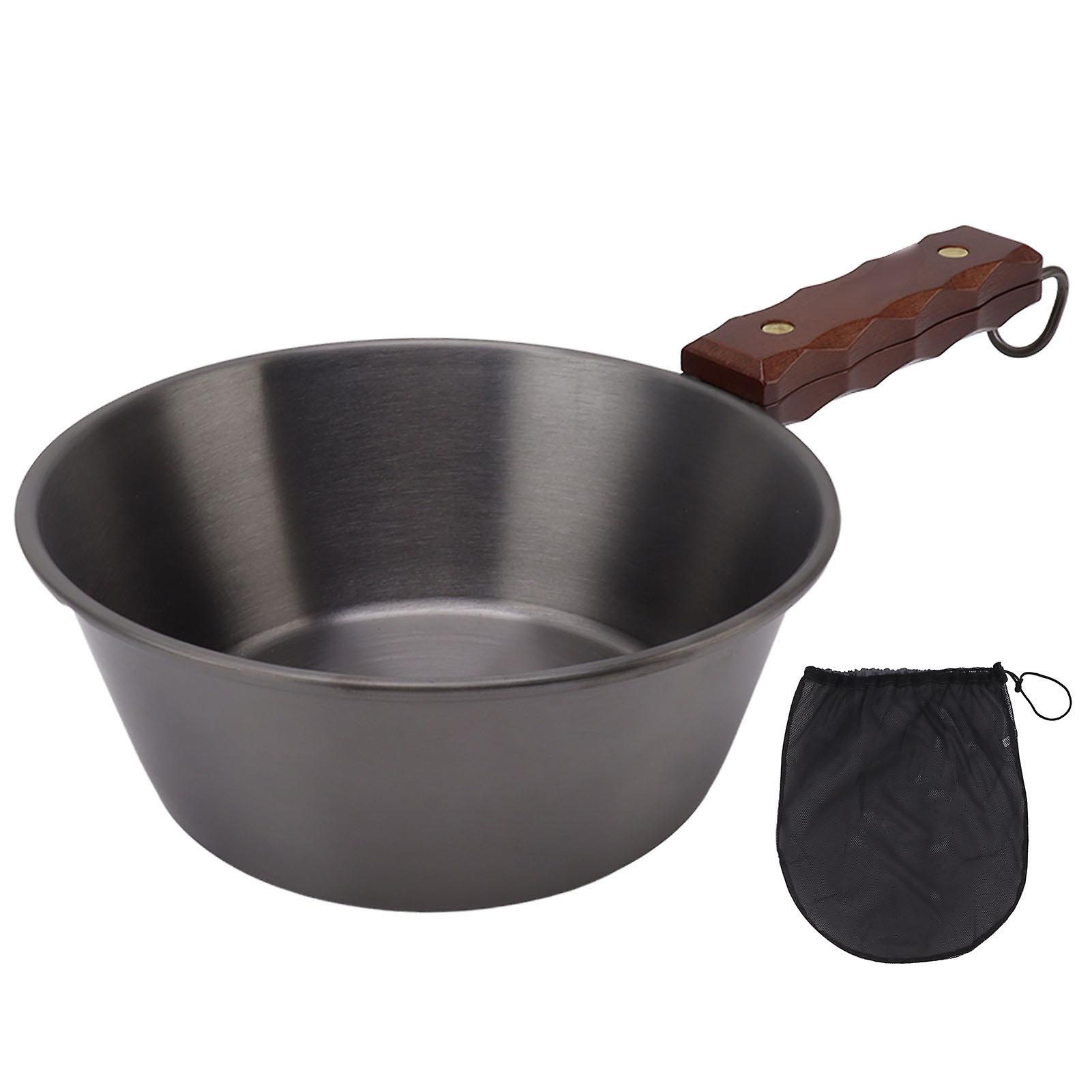Camping Skillet 304 Stainless Steel 2000ML Wood Handle Safe Portable for Outdoor Hiking Picnic Black