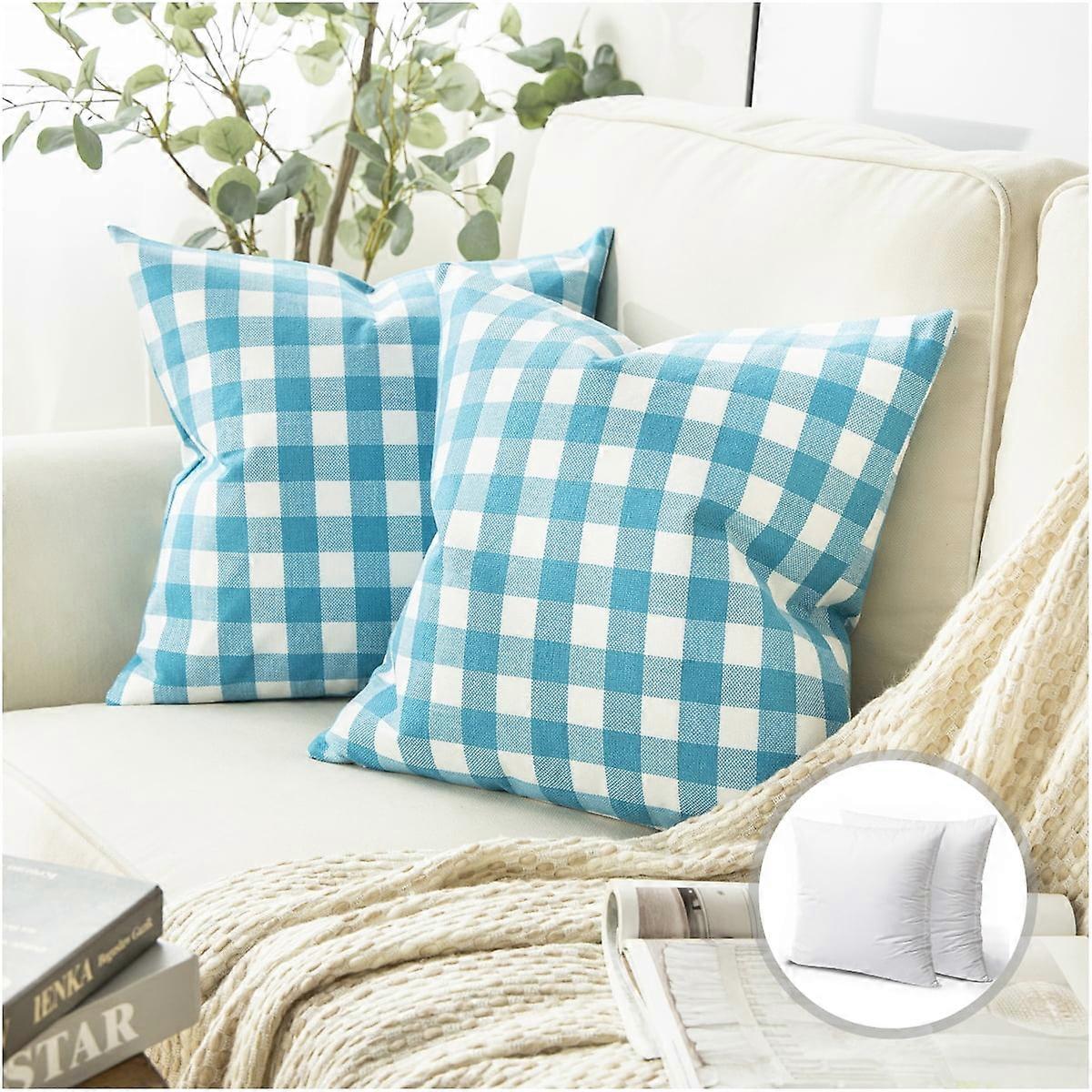Phantoscope Checkers Series Square Decorative Throw Pillow with Inserts, Classic Retro Plaids, 18"x18", Sky Blue/White, 2 Pack