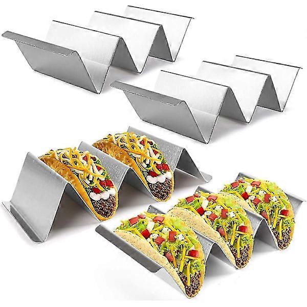 Food-Safe & Durable Taco Holders Made from food-safe 430 stainless steel. Each holder is 0.04 inches thick, 8.7 inches long, 4 inches wide, and 2 inches high – thicker and larger than most. Dishwasher, Grill, and Oven Safe: Also great as a metal baking rack. Use for baking taco shells, reheating tacos, warming tortillas, or leftover restaurant tacos. Easy to Grip: Easy-grip handles with horizontal wings make lifting, holding, serving, and cleaning easier than other stands. Easy to grip with oven mitts and kid-friendly. Dual-Sided Use: One side holds 3 tacos, the other holds 2. Keeps Tacos Upright: Designed to keep your tacos neat and upright. Suitable for soft or hard shell tacos, fajitas, sandwiches, tortillas, burritos, and even waffles. Perfect for dinner tables, restaurants, buffets, parties, picnics, and outdoor use.