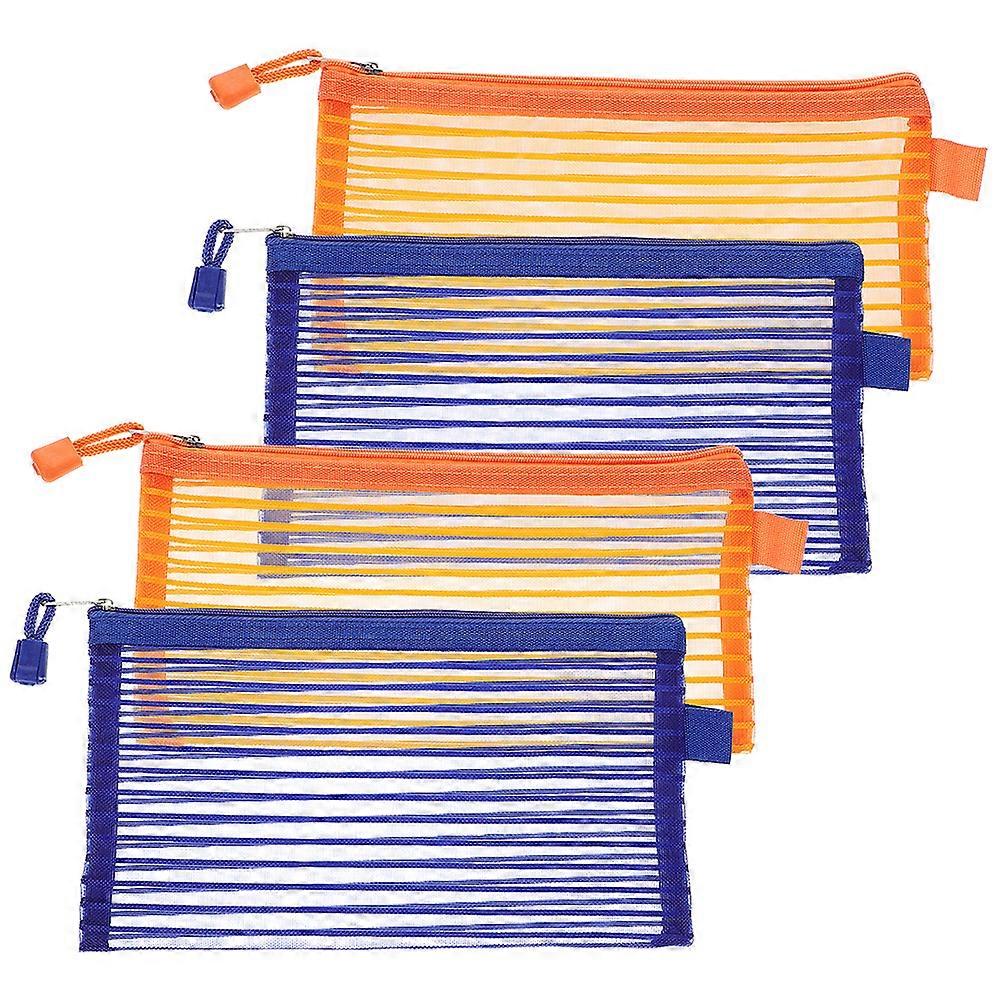This is a set of storage bags, made of and practical materials. Suitable for students or workers, suitable for storing documents, most pens or other stationery. They are simple in design, but very practical to use, which brings you great convenience. Features -Color:Blue, orange -Material:Polyester and aluminum alloy -Size:23.00X11.00X0.20cm/9.04X4.32X0.08in -This zipper pouch is made of aluminum alloy and polyester, which can be wear resistant, strong and . -With clear appearance, wear resistance, , sturdy, reusable and other characteristics. -The zipper file bag van store files, stationery, cosmetics and daily toiletries, and other small items. -These are practical and visible zipper file bags that can be used for home storage and travel. -Large quantities, they can be used interchangeably, thus give you a good mood. Package list: 4 x Zipper Pouches